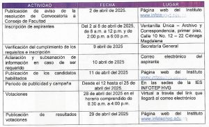 ARTICULO SEGUNDO, FECHA Y LUGAR DE INSCRIPCIÓN. El término y lugar para las inscripciones de los candidatos inicia el día 2 de abril de 2025 y finaliza el 8 de abril de 2025, en la Secretaría General de la IES INFOTEP HVG.