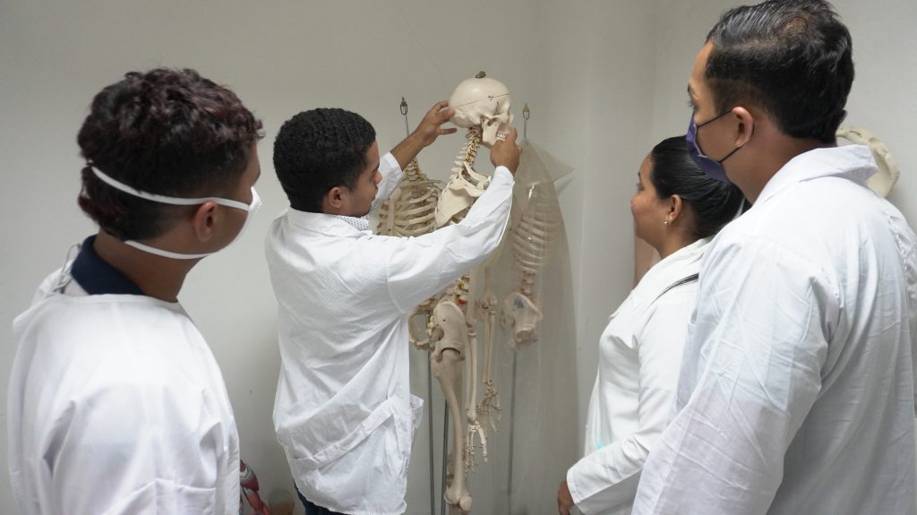 Posteriormente, la docente Campo Cantillo, orientó una dinámica con los esqueletos disponibles en el laboratorio. En ella mostró el sistema óseo y su desenvolvimiento en el ámbito laboral. Esto permitió a los estudiantes adquirir nociones que deben tenerse en cuenta al desarrollar matrices de riesgo laboral.
